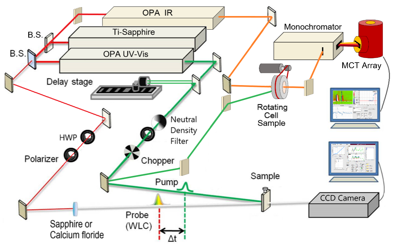 Transient absorption pump-probe spectroscopy (TA) in the Glusac lab is accomplished using the setup depicted in the diagram below. This setup is actually two instruments in one, with the first providing capabilities in the visible and ultraviolet range (beam coupled to CCD camera in block diagram), and the second providing capabilities in the infrared region (beam coupled to MCT detector).