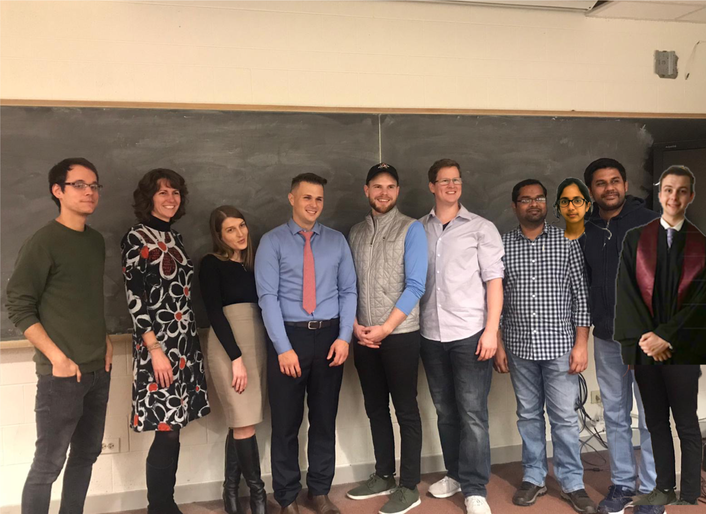 October 19, 2019. Stefan succussfully defended his thesis entitled "Designing Biomimetic NADH-Analogs for Artificial Photosynthesis," making him the first student to do so since the move to UIC. After the defense we enjoyed a celebratory reception. Some couldn't be present, but a rudimentary photoshop did the trick. |